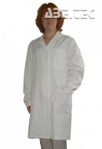 Antistatický pracovní plášť je ušit z tkaniny z kompozice polyester, bavlna a kovové vlákno. Toto složení zajišťuje požadované antistatické vlastnosti, nízkou hmotnost a současně i velmi dobré pocity při nošení. Plášť nemá „nepříjemné“ vlastnosti syntetických tkanin, které se projevují zejména v letních měsících a působí nepříznivě na osoby, které je používají.