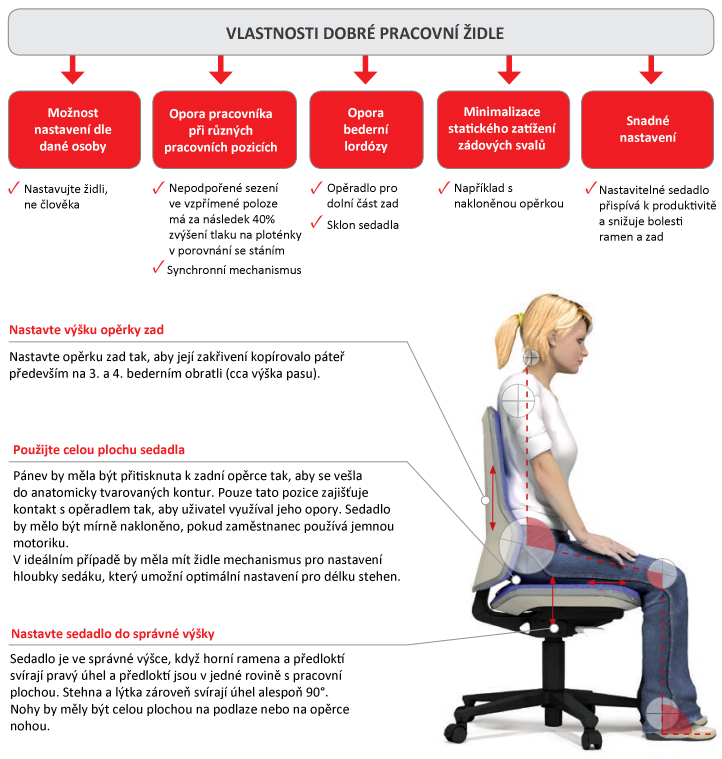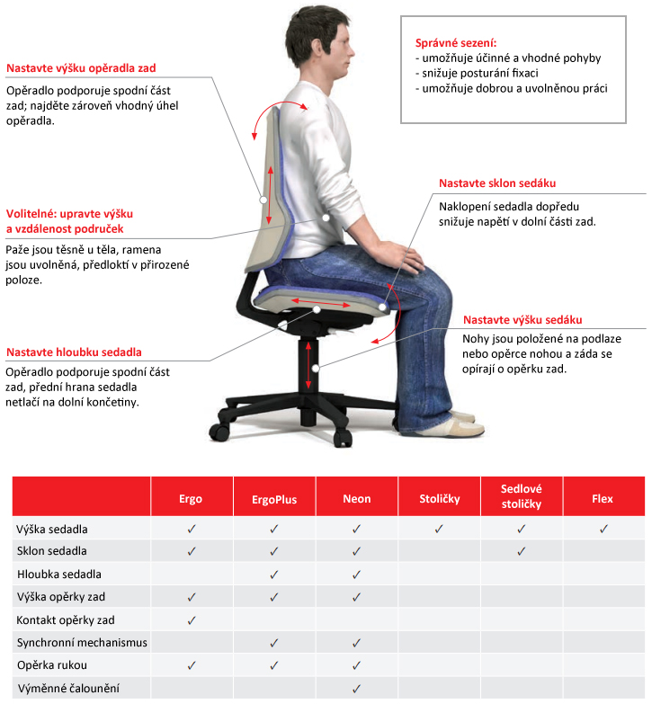 Ergonomické vlastnosti židle jsou důležitou součástí dobře fungujícího, ergonomického a uživatelsky přívětivého pracoviště. Dobrá pozice sezení umožňuje účinné a odpovídající pohyby, snižuje posturální fixaci a umožňuje správný a uvolněný pracovní postoj. Židle samotná však nedokáže zlepšit ergonomii sezení. Musíte si ji nastavit podle svých potřeb a proporcí.